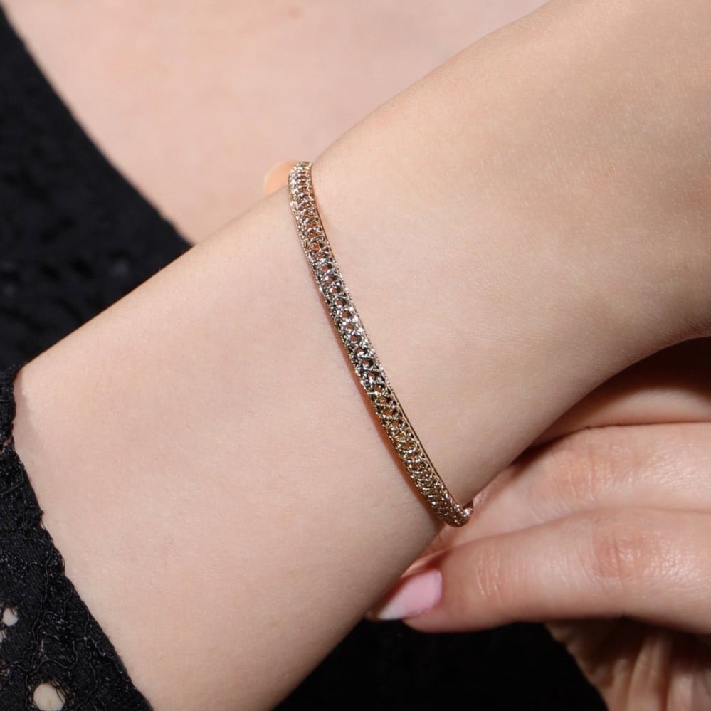 • تم تصميم اسوارة ناعمة من الذهب النقي عيار 18 الأمر الذي يضمن الإبقاء عليها ذات طابع عصري مناسب لكافة الأذواق.
